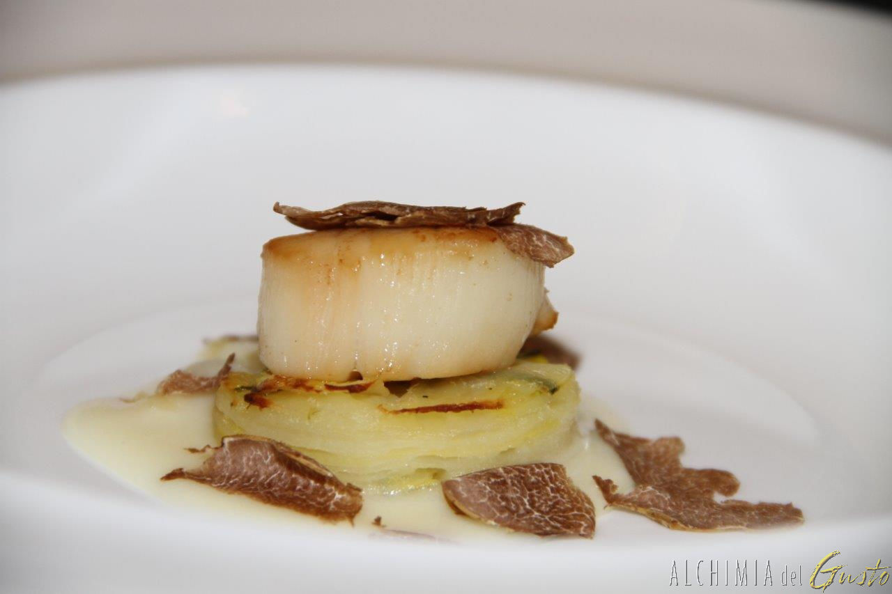 Capesante scottate su spuma di crostacei e le sue chips