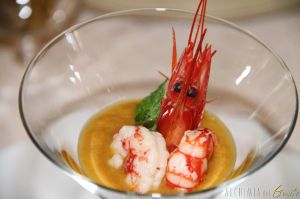 Gambero rosso scottato in fonduta di verdura aromatizzato al vermouth dry