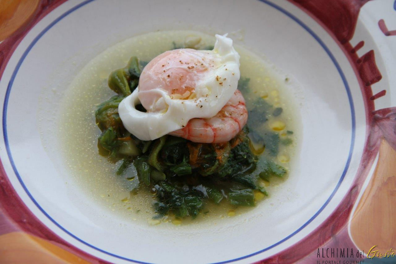 Minestra di zucchine e gamberi con uovo affogato