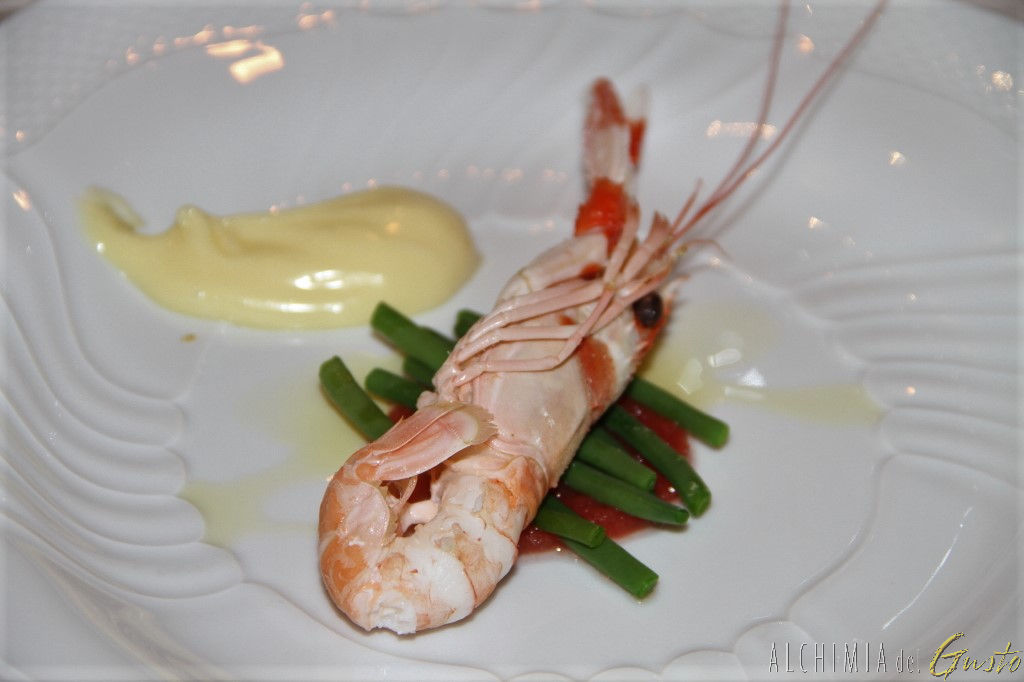 ed inizio con piccolo benvenuto:Pomodore fresco fagiolini in erba e scampo dell’alto tirreno