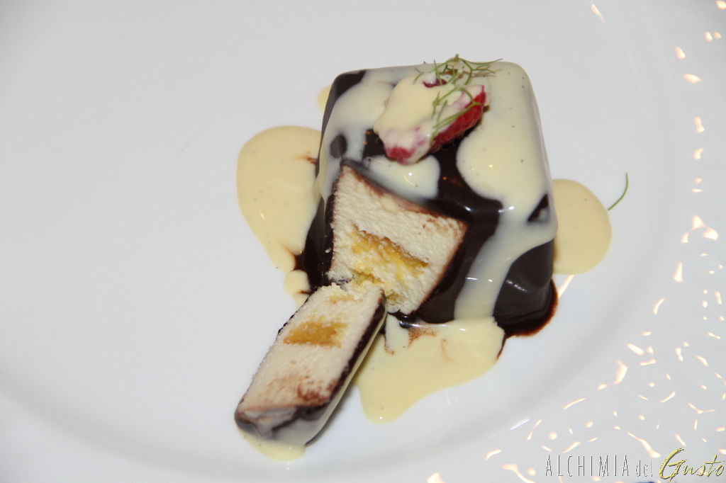 “DESSERT VIAREGGIO” Pan di Spagna, zabaione gelato, crema al whisky e glassa al cioccolato
