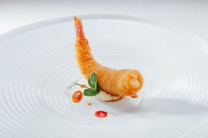Gamberoni pasta kataify succo peperoni e pure al basilico