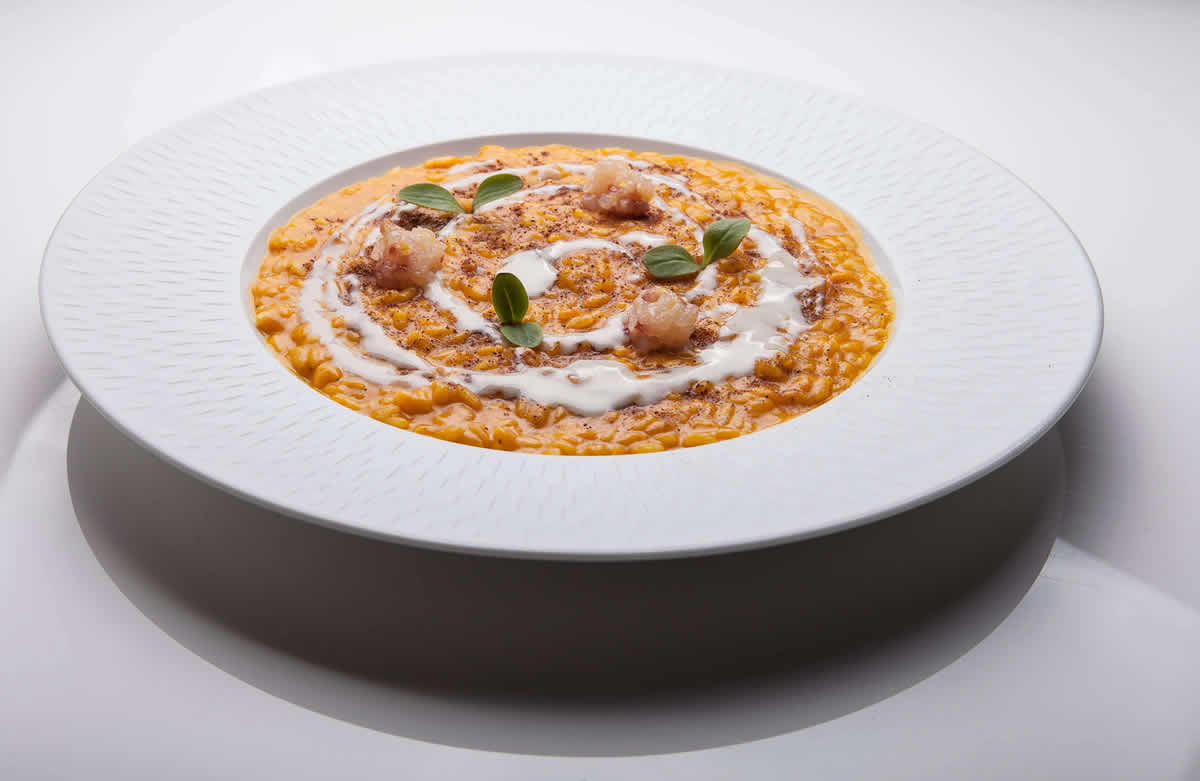 Riso zucca gorgonzola battuta astice