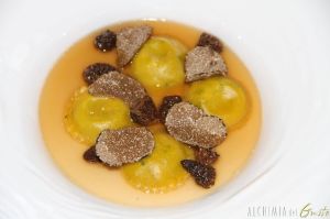 Fagotelli agli asparagi affumicati, consommè di spugnole e tartufo nero