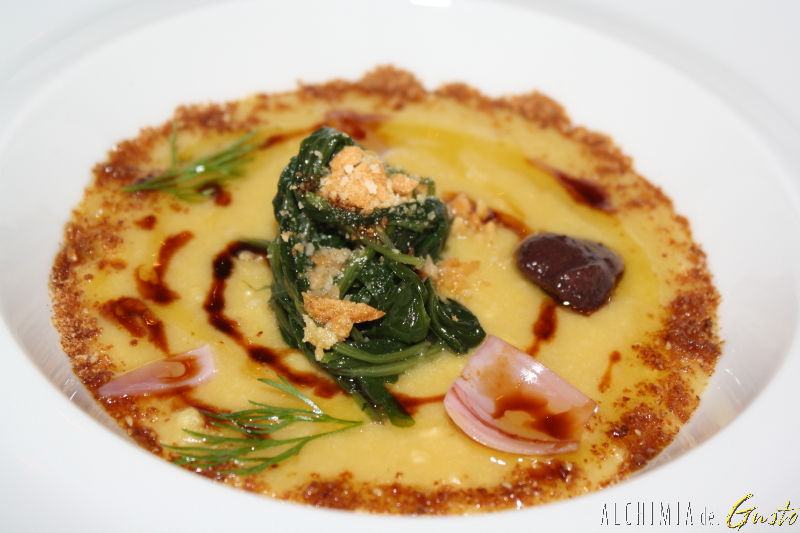 Cicerchie delle Murge in crema con marasciuolo selvatico, mosto cotto di fichi, lampascioni e olive Nolche, con biscotto mostacciolo