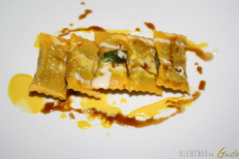 Tortelli farciti di ossobuco di Fassone piemontese e midollo nel suo ristretto allo zafferano sardo e parmigiano Bonati