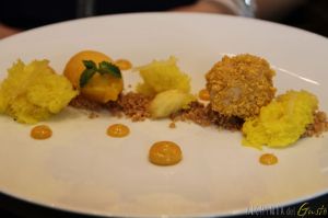 Raggio di sole Caramella ghiacciata alla banana spuma di limone, albicocche croccanti, sorbetto al mango con crumble di mandorle e marmellata di arance.