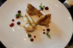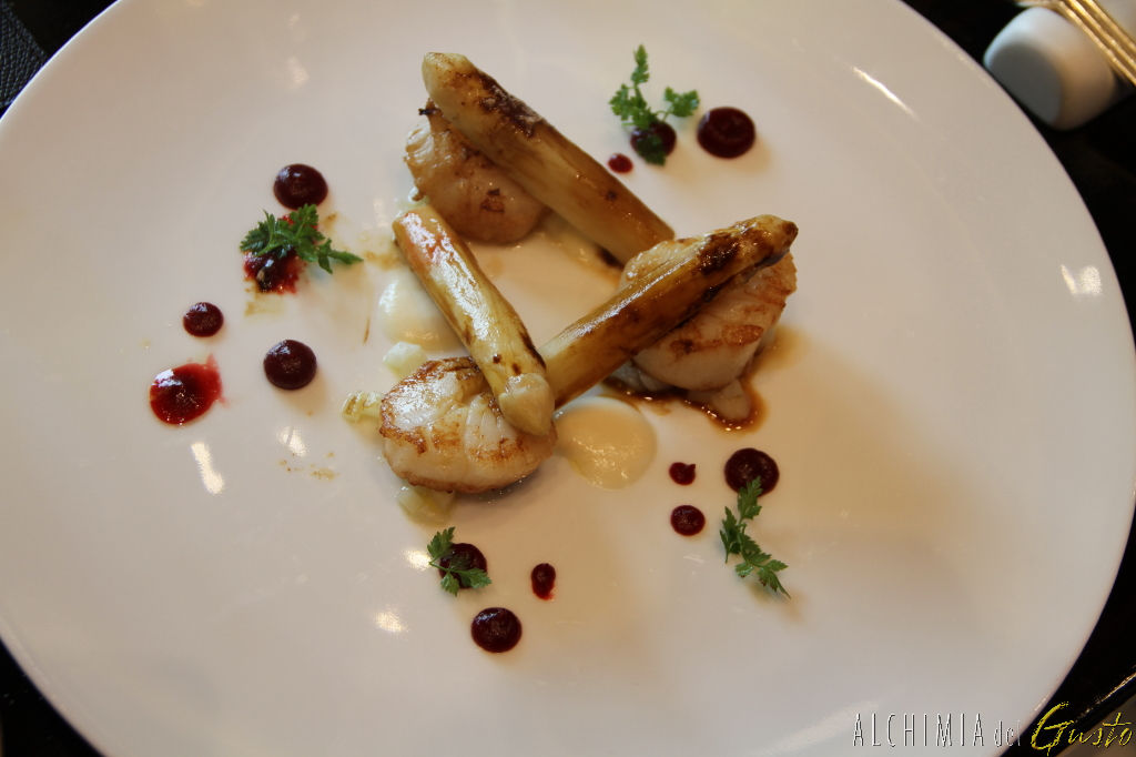 Cappesante asparagi bianchi di Cima d’olmo bruciati alla liquirizia e ketchup di barbabietola
