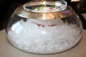 Tartare di gamberi rosso di Mazara del Vallo con pinoli ed estratto di pomodoro e spuma di mozzarella di bufala.