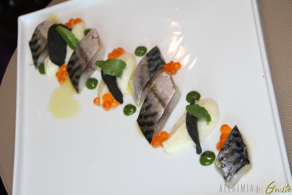 Sgombro marinato con aceto, cremina di pastinaca, uova di salmone e pesto di crescione.