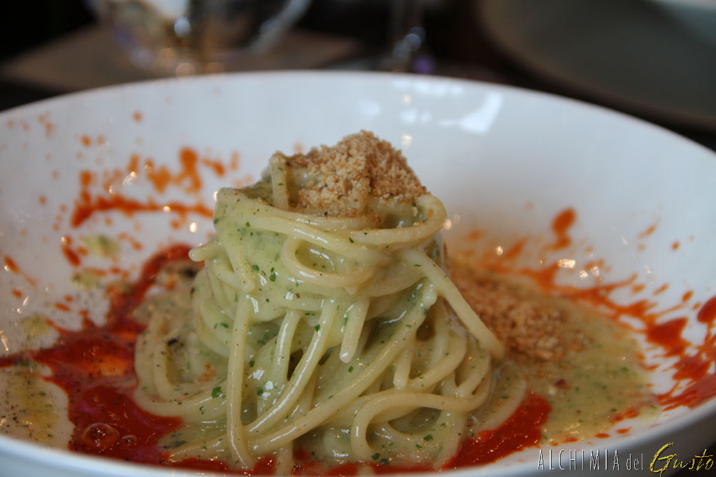 Spaghetti aglio olio e peperoncino servito su una salsa di corallo di gambero alla brace con pane atturrato.