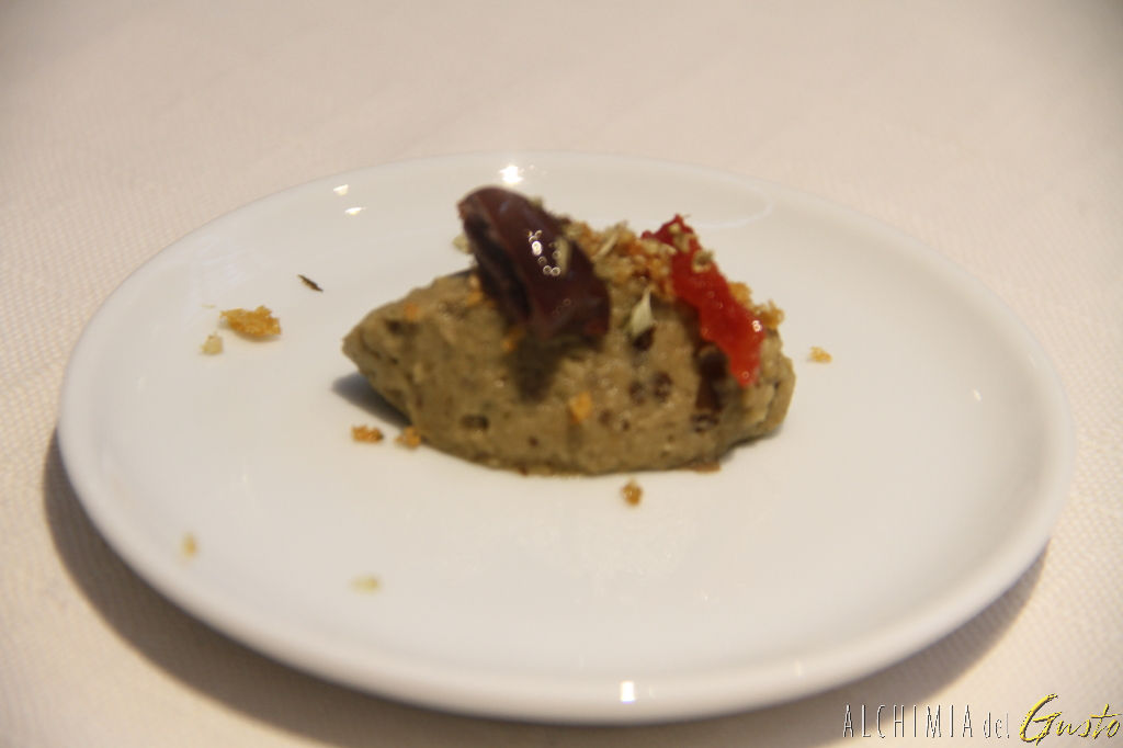 Crema melanzana alla soia, oliva taggiasca origano, pomodoro disidratato