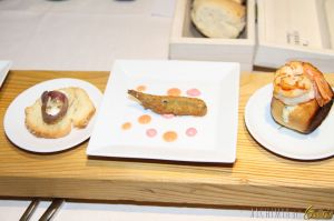 Finger food di mare: sarda fritta tripping di salse, panino coi gamberi e maionese ai gamberi.