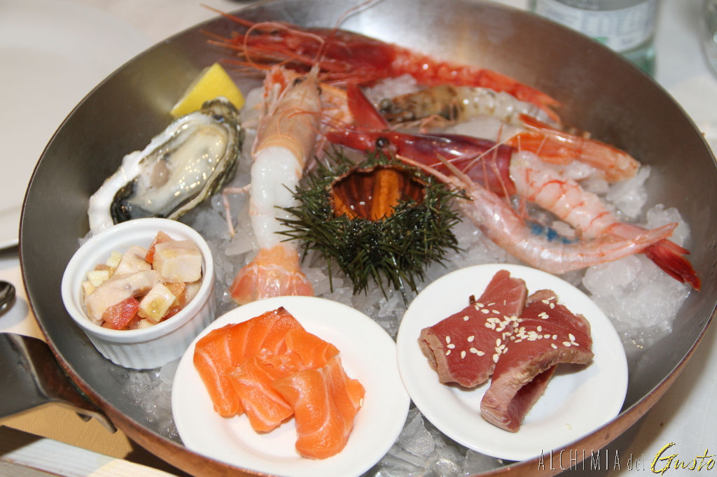 Viaggio di mare: salsa di soia salsa di lime e mela verde sashimi di salmone , tataki tonno rosso e sesamo, ceviche di spada con pomodoro e sedano, ostrica tentacion, gambero rosso di sicilia, di viareggio, atlantico, viola da santa margherita ligure, gambero gobbetto, riccio di mare e scampo.