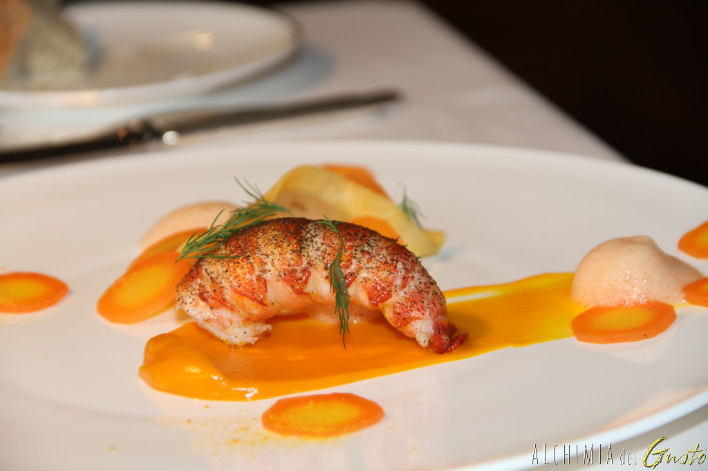 Aragostella accompagnata da confettura di carote spuma calda di arancia e crema di arancia polvere di shizo e foglia di aneto