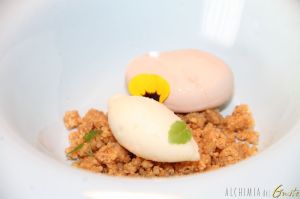Sasso alla mandorla, sorbetto mela cotta e crumble di frutta secca.