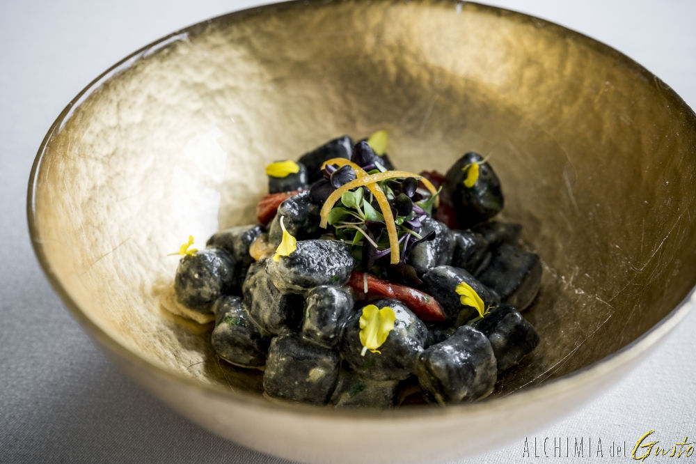 Gnocchetti di patate al nero di seppia spadellati con vongole, datterini e limone confit
