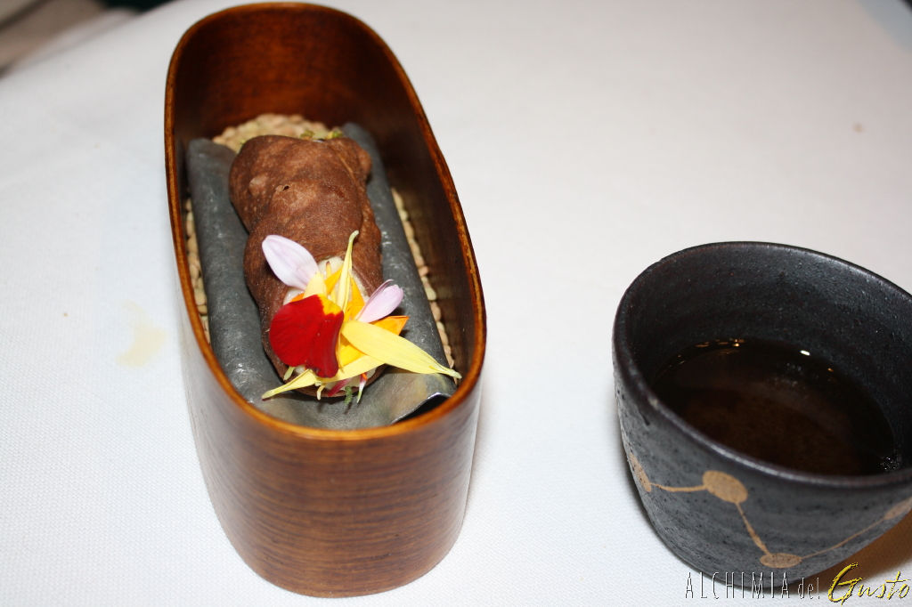 Cannolo siciliano ripieno di baccalà mantecato accompagnato da un brodo di lenticchie