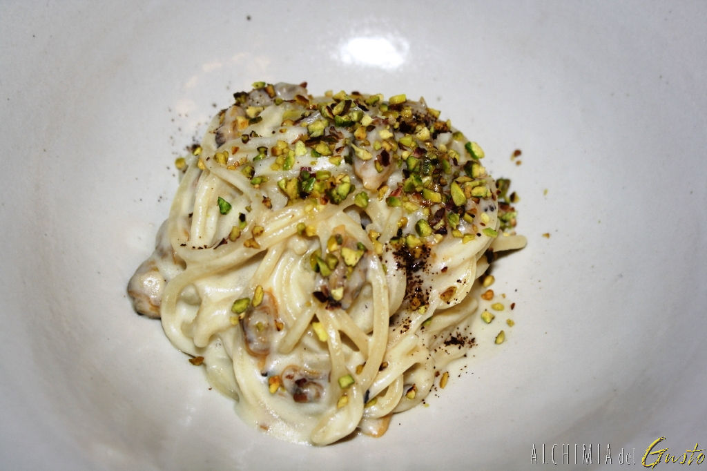 “Omaggio a Noto” spaghetti con latte di mandorle, vongole e pistacchi profumata con grappa in accompagnamento un estratto di olive