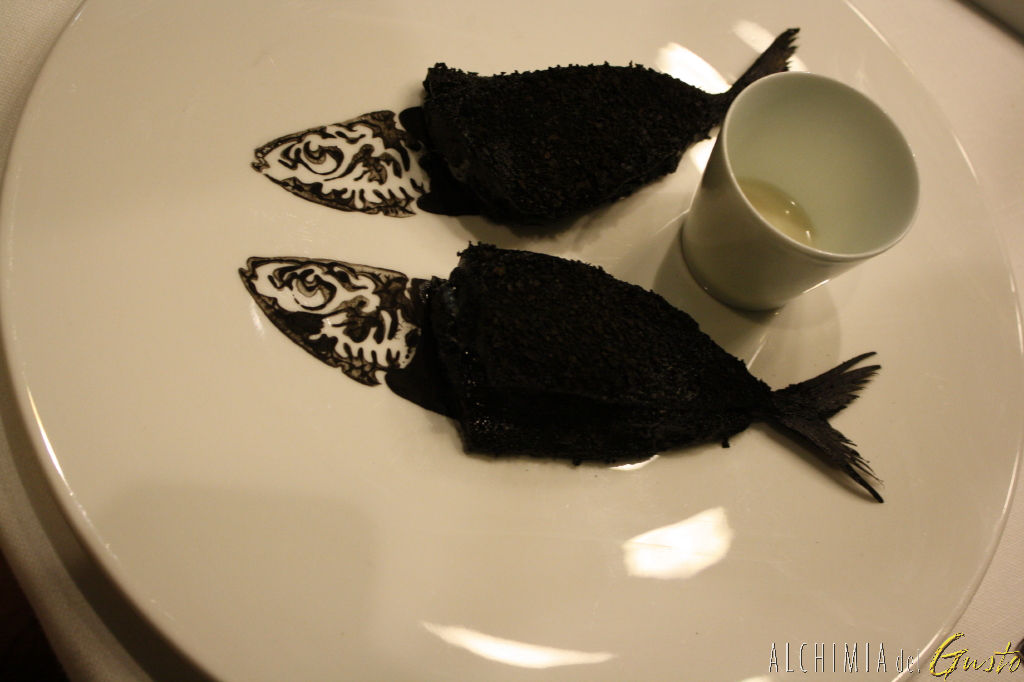 Sgombro Gyotaku ripieno di mousse di capasanta finocchietto selvatico e zeste di agrumi cucinato con carbone vegetale da gustare sorseggiano un brodo di latte di pinoli