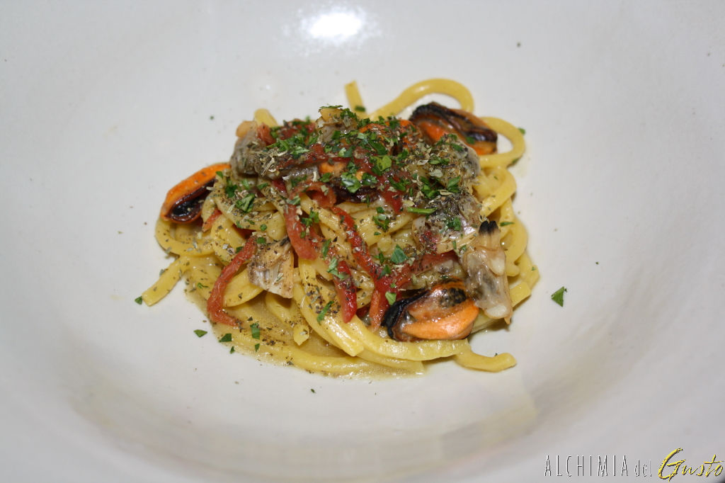 Spaghetti chitarra con cozze, vongole e pomodorini essiccati, da sorseggiare con un brodo di pesce