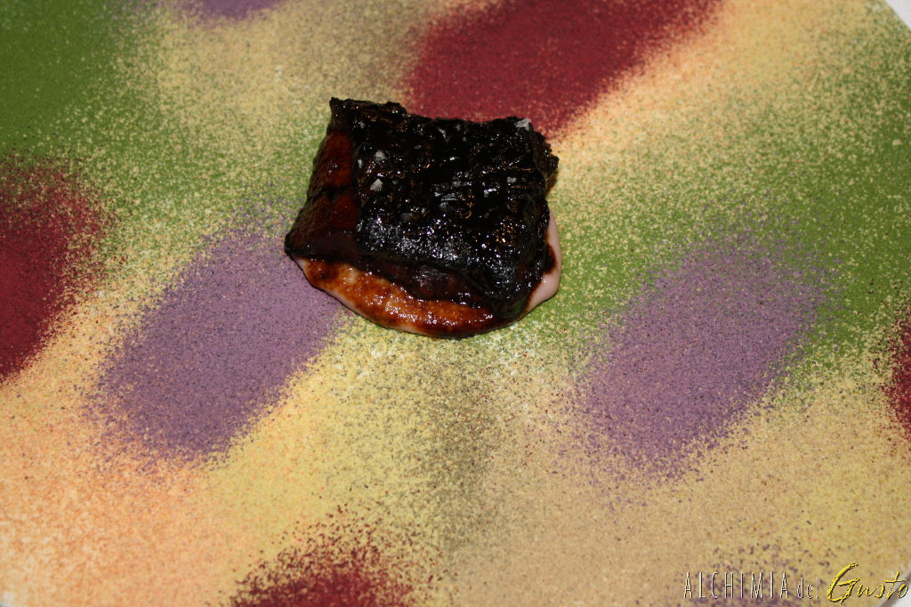 Anguilla laccata nell’aceto balsamico su panorama di verdure in polvere