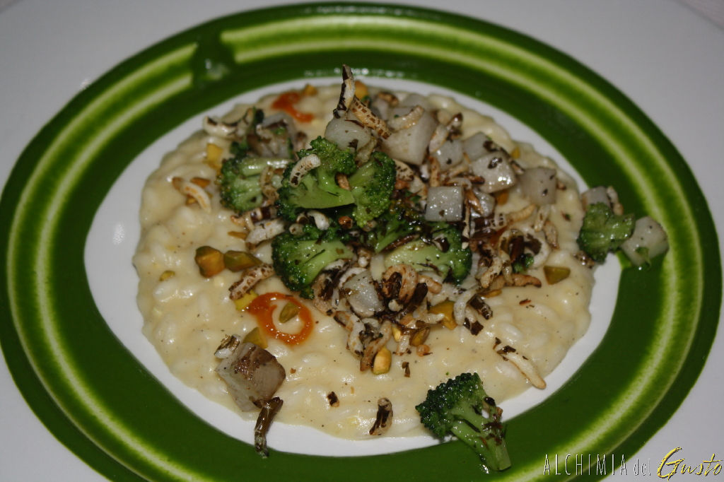 “L’ombelico del mondo” Risotto alla siciliana, con arance e pistacchi, sentore di finocchietto, pesto di cime di rapa, topinambur e riso nero ben arrostiti