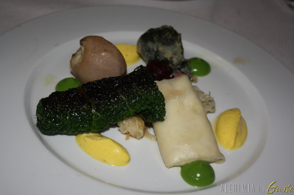 “L’alchimista” Piatto dedicato all’amico Stefan Wiesner, gran bollito vegetariano con fagottino di verza, toma e funghi, canederlo di saraceno, patata viola e taleggio, e altre verdure, due salse, una verde e una al curry himalayano, il nostro crauto di cavolo cappuccio al ginepro