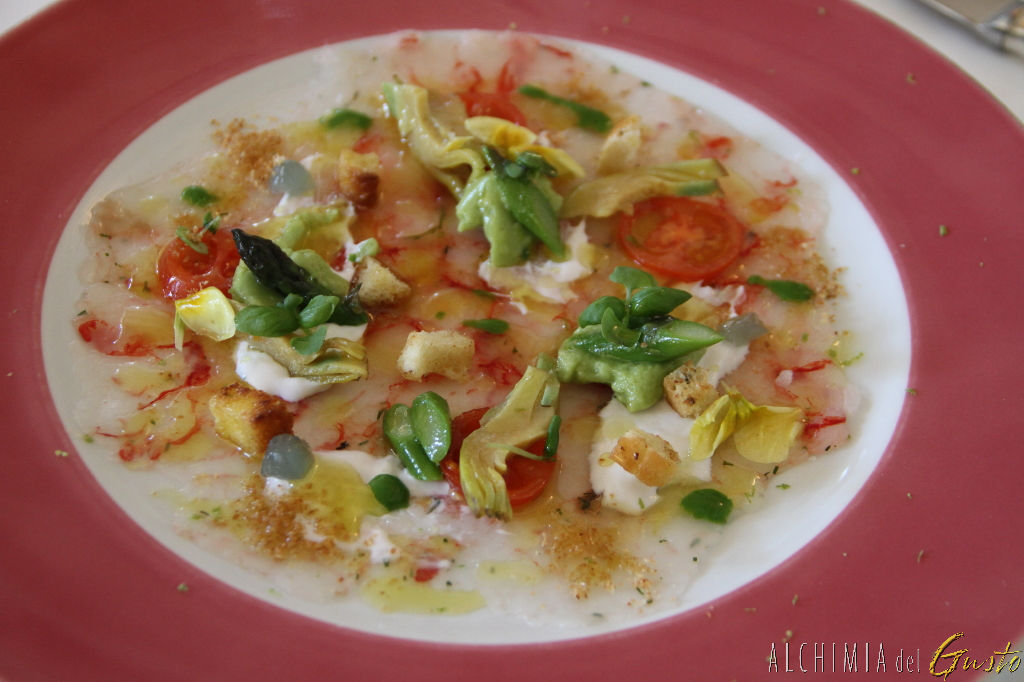 Carpaccio di scampi e gamberi, crema al cocco e lime con carciofi e punte di asparagi pomodorini confit