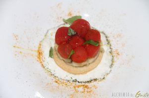Melanzana, pomodorino freschi e biscotto di parmigiano su crema di burrata