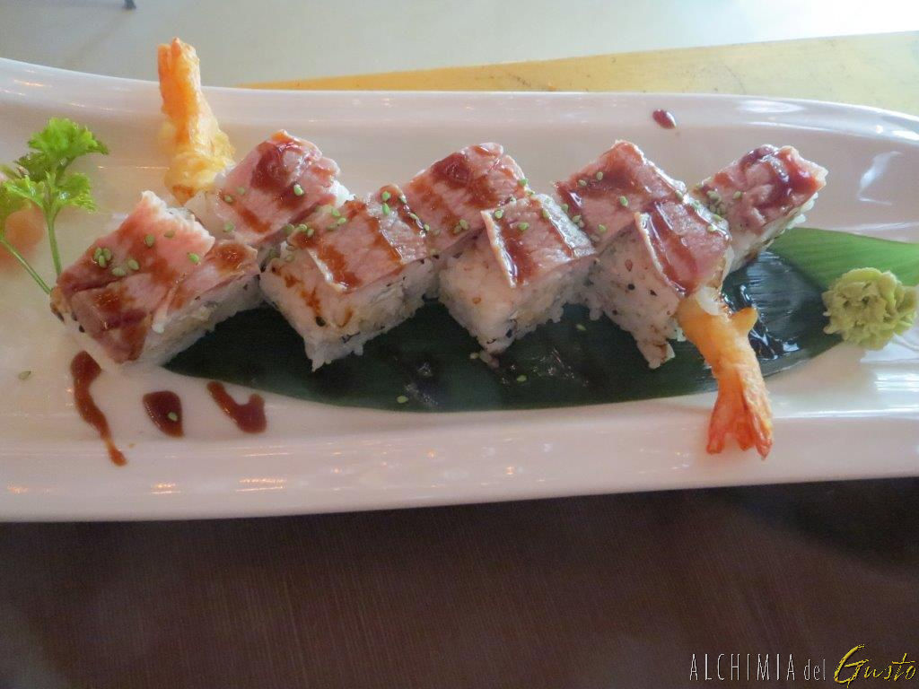 Tataki Roll: Tempura di gamberone, cream cheese, ventresca flambù