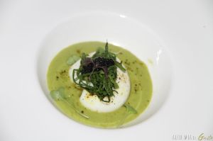 Uovo morbido su crema di asparagi polvere di camomilla e bruscandoli