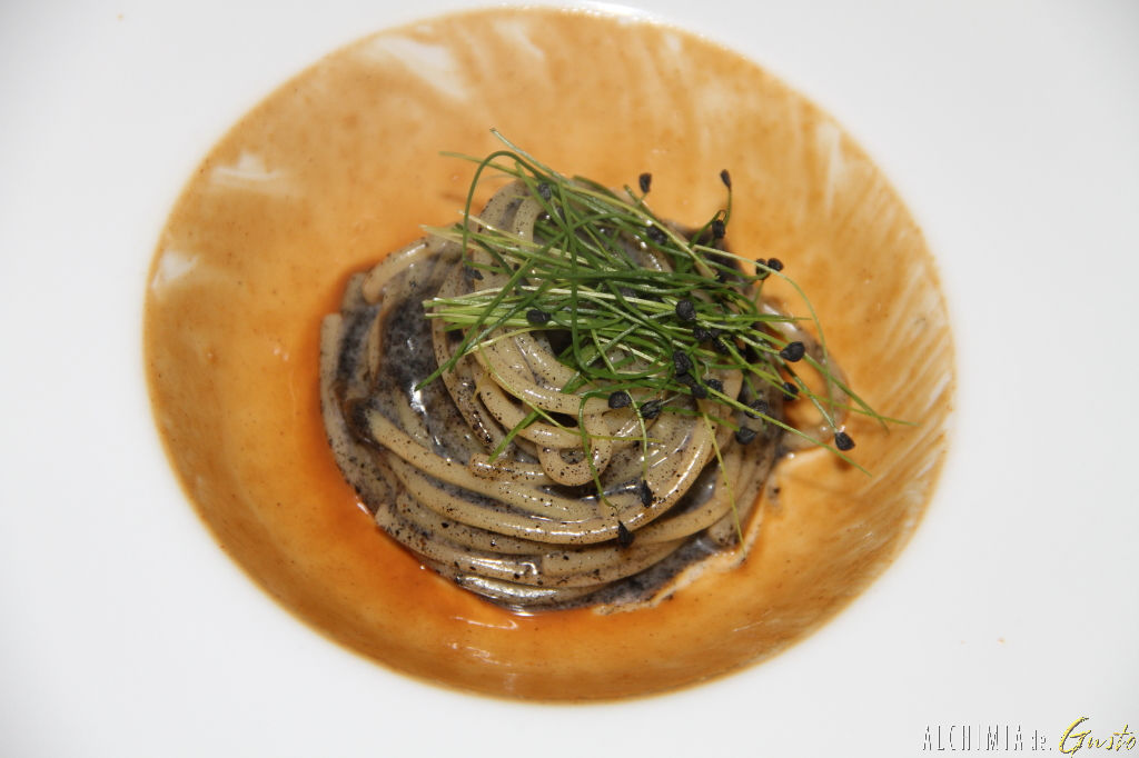 Spaghettoni di monograno Felicetti con burro di Alpeggio e cenere di cipolla e ristretto alle nocciole
