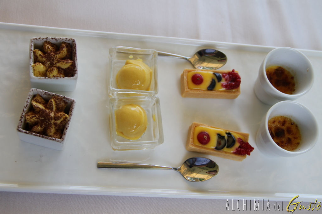 tiramisù con amaretti croccanti, tartellete frutti di bosco, creme brulee alle fragole