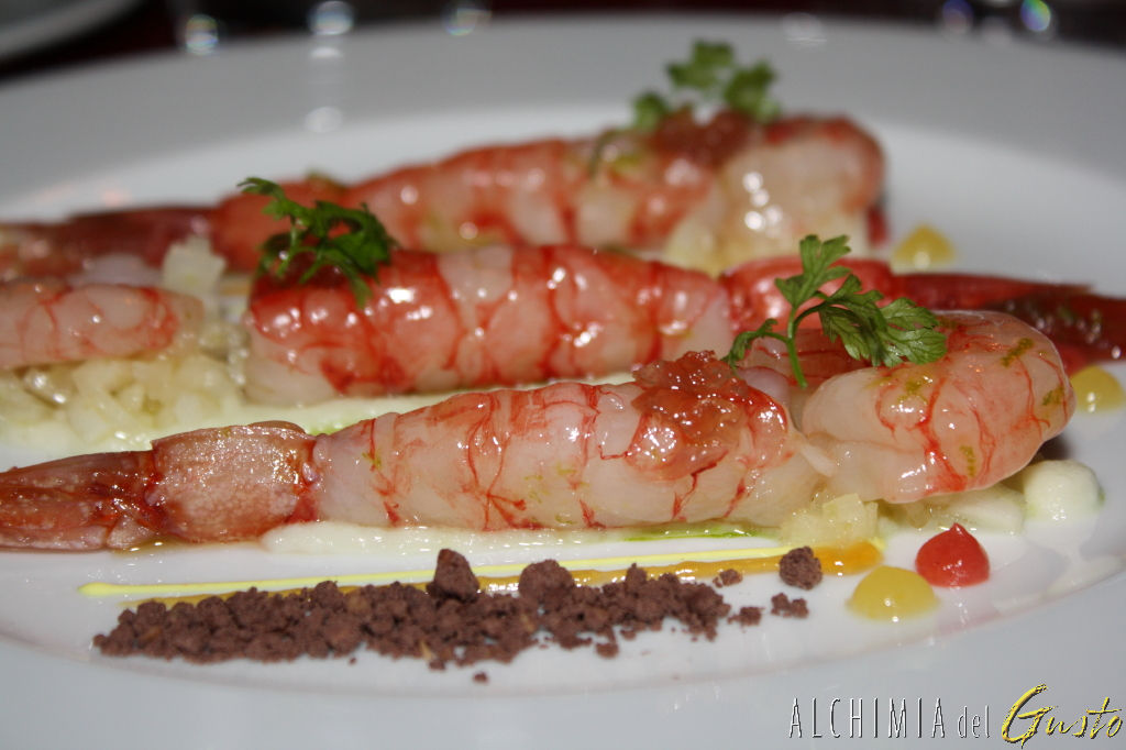 Gamberi di Sicilia crudi, finocchi arancia e cioccolato