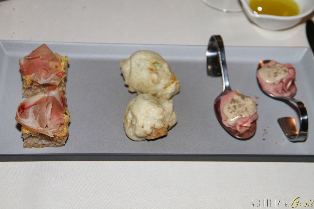 Vitello tonnato, fiori di zucca in pastella ripieni di ricotta e focaccia fatta in casa con prosciutto crudo stagionato
