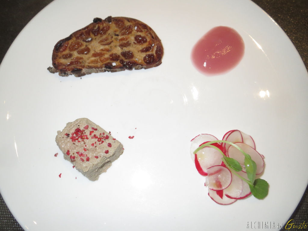 Paté di fegatini di pollo, mostarda e insalata di rapanello, pepe rosa e pane all’uvetta. (attenzione alla mostarda di rafanello è molto forte )