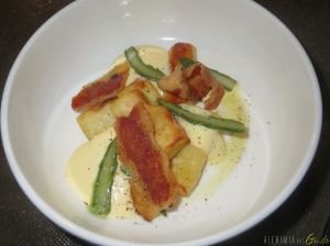 Gnocchi di patate arrostiti, salsa alla carbonara, punte di asparagi e guanciale croccante