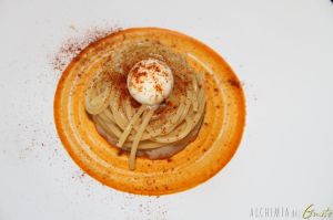 Spaghettoni Felicetti, burrata di Molfetta, tartare di scampi e peperone crusco di Senise.