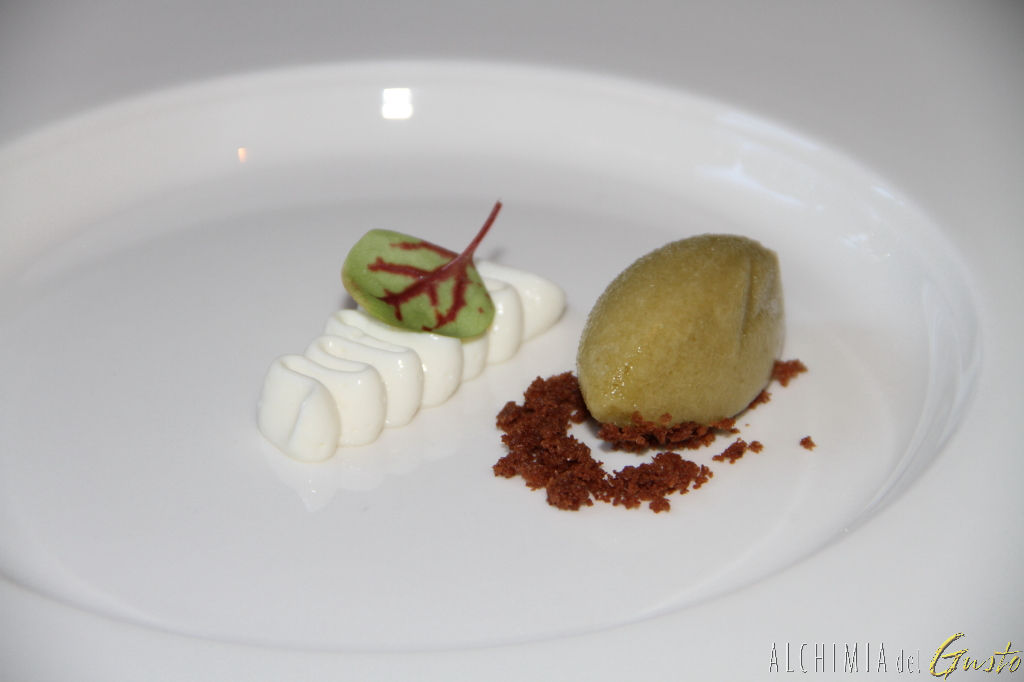 Eccomi infine al predessert: Sorbetto al basilico, gelato al caffè e polvere di cioccolato