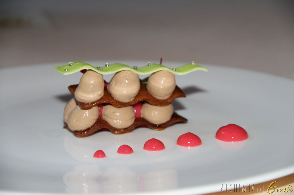 Dessert mille veli al caffè: mille veli croccante, vellutata al caffè emulsione di riso e croccante di cioccolante