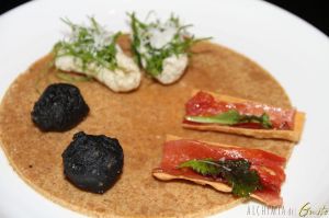 Piccola entrèe: bon bon di baccalà al nero – cotenna soffiata con bieta e parmigiano