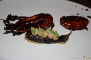 Moscardino laccato ai frutti rossi, melanzana perlina e pomodoro