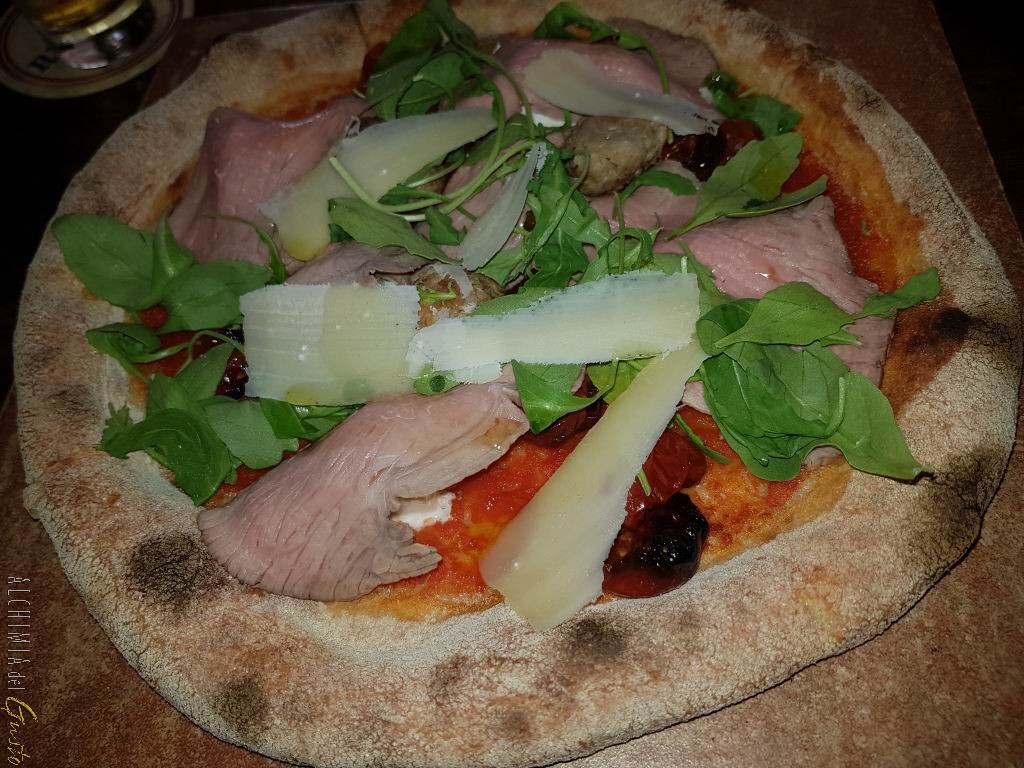 Pizza Biscottata di carne € 16,00 Blend di pomodori selezione italiana, battuto al coltello in hamburger di scottona piemontese, sfere di bufala campana, carpaccio crudo di magatello di manzo con scaglie di grana, uovo marinato cotto e rucola