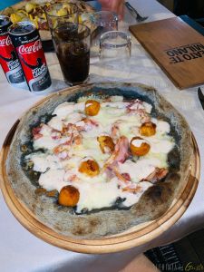 CROCCHETTEZZA: Fior di latte, pancetta, scamorza, crocchette di patate, fonduta leggera allo zola con noci
