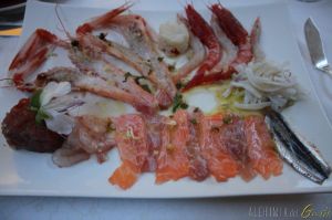 La composizione di pesce crudo: scampi gamberi, tartara di tonno seppia, ”sushi bergamasco” e ostriche