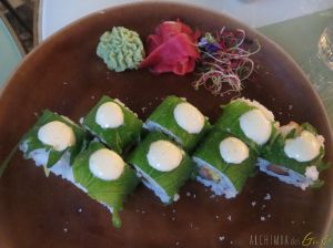 VERDE SHISO: salmone, mango, avocado avvolto da foglia di shiso con maionese di wasabi e salsa ceviche