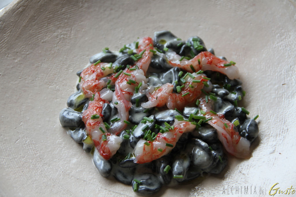 ORECCHIETTE AL NERO DI SEPPIA con crema di cacio e pepe, gamberi rossi crudi