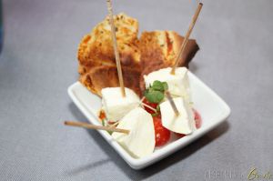 Una piccola entrèe per l’aperitivo offerto: Bufala, pomodorini e pane carasau
