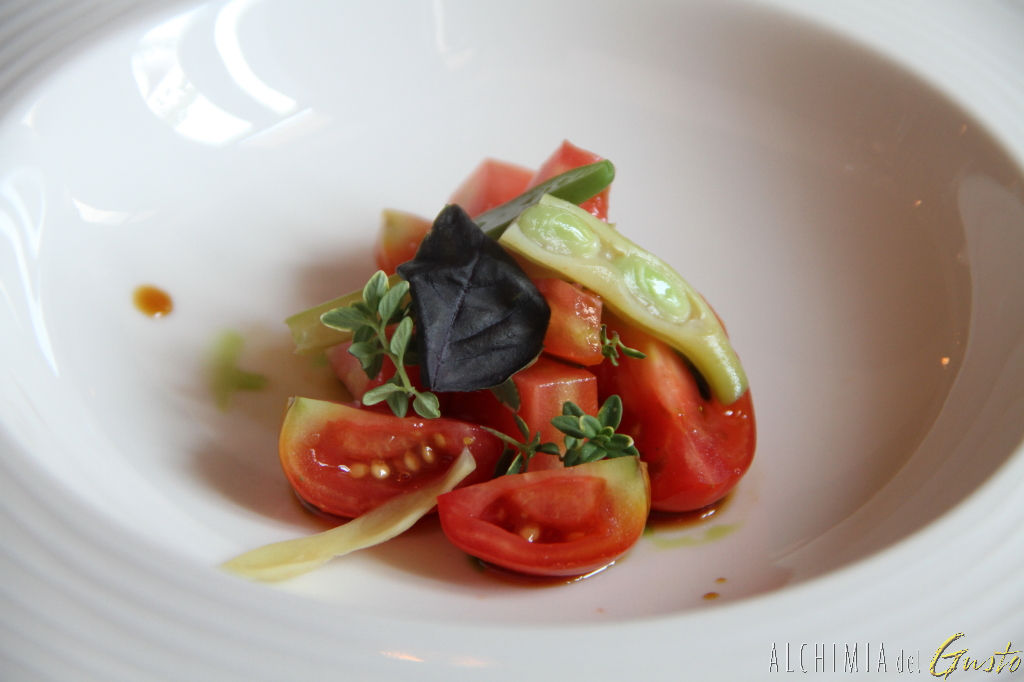 Insalata di pomodoro e fagiolini e salsa di coregone fermentato.